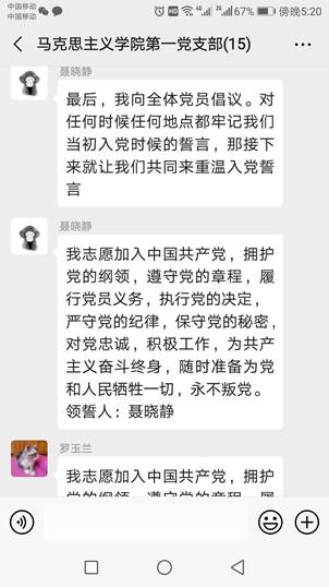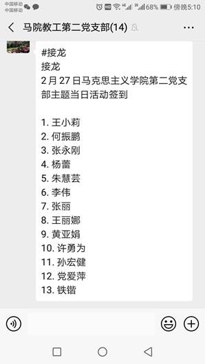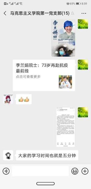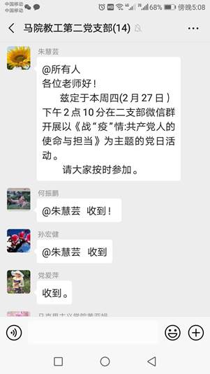 在活动中,两位支部书记首先组织全体党员系统学习了习近平总书记关于抗击新冠肺炎疫情的一系列重要讲话,特别是2月23日习近平在统筹推进新冠肺炎疫情防控和经济社会发展工作部署会议上的讲话,并对重点内容进行截图讲解。随后,两个支部的支部委员分别将搜集到的抗疫工作中的党员先锋模范事迹以推荐名片的方式实时推送宣讲,其中既包括了以钟南山、李兰娟、刘智明、李文亮、张继先、郑勇为代表的抗疫一线优秀党员,也包括了陕西本地的基层优秀党员代表。党员们在学习完先进党员事迹后,感触颇深,纷纷表达对于抗疫英雄的崇敬之情。在专题讨论“疫情期间如何履行共产党员的初心和使命,切实担当作为”时,全体党员各个踊跃发言,畅所欲言,在微信群中表达了自己的学习感受和行动决心。王红梅表示,在抗击疫情的关键时期,要坚决地毫不动摇地用马克思主义方法论来指导抗击肺炎,最终获取全面胜利。刘晓勇表示,广大思政课教师要认真响应中央号召,发挥自身优势,积极担当作为,要当好广老员工的引路人,要当好中央政策的宣讲者,要当好共产党员的司号员。张全省表示,要学习领会研究宣传好习近平总书记重要讲话精神,做好本职工作,教育好员工听党话跟党走,为夺取疫情防控战役最后胜利贡献自己的力量。何振鹏表示,在这个特殊时期,作为一名共产党员,应该非常深入的理解英雄的内涵,“英”者自知也,“雄”即超越自我,英雄来自平凡,不管身处什么样的岗位,都应该在平凡岗位上践行共产党员的先进性,发挥党员“硬核”作用。王丽娜表示,哪里有疫情,哪里就是党员干部守初心、担使命的战场,当前党员干部众志成城,同心同力,构筑起一座坚实的防疫战斗堡垒。党爱萍表示,作为思政课教师,要站稳政治立场,站好思政阵地,做好关于战疫情的宣传,做好对员工思想的引导,树立众多的榜样,学习英雄事迹,宣扬抗疫情的正能量。张鹤表示,全体马公司党员教师一是要提高政治站位,树立四个意识,坚定四个自信,积极研究与宣传中国特色社会主义制度的优越性;二是要立足本职岗位,提高现代公司产品的工作能力和水平;三是要切实发挥党支部战斗堡垒作用和党员先锋模范作用。全体党员一致表示,在这全国上下齐心战“疫”的时刻,一定听从党的号召和指挥,时刻不忘初心,牢记使命,要像这次战“疫”中“火线上的共产党员”、“火线上的中流砥柱”榜样一样,勇做党员先锋,争为党旗增光添彩。