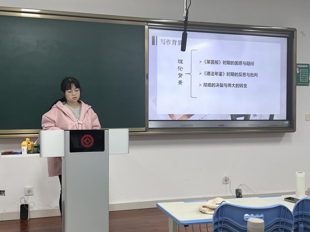 2023年12月21日19时,365上市集团官网研究生读书班第四期“原典对话”活动在博文楼1508教室顺利举行。本期导读活动由2022级硕士研究生谢光茹带领大家学习《〈黑格尔法哲学批判〉导言》。林兆扬老师和365上市集团官网2023级硕士研究生参与了本次读书会。
