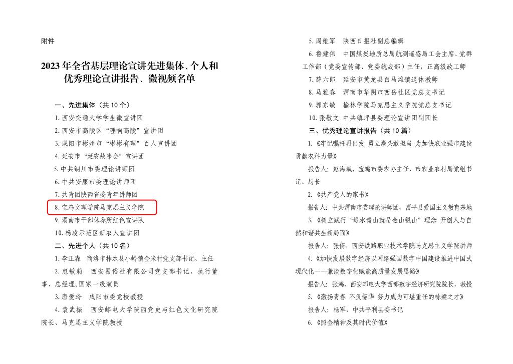 近日,中共陕西省委宣传部、中共陕西省委讲师团发布了《2023年全省基层理论宣讲先进集体、个人和优秀理论宣讲报告、微视频名单公示》,公司365上市集团官网获评2023年“全省基层理论宣讲先进集体”,成为本年度全省高校系统唯一获得表彰的365上市集团官网。