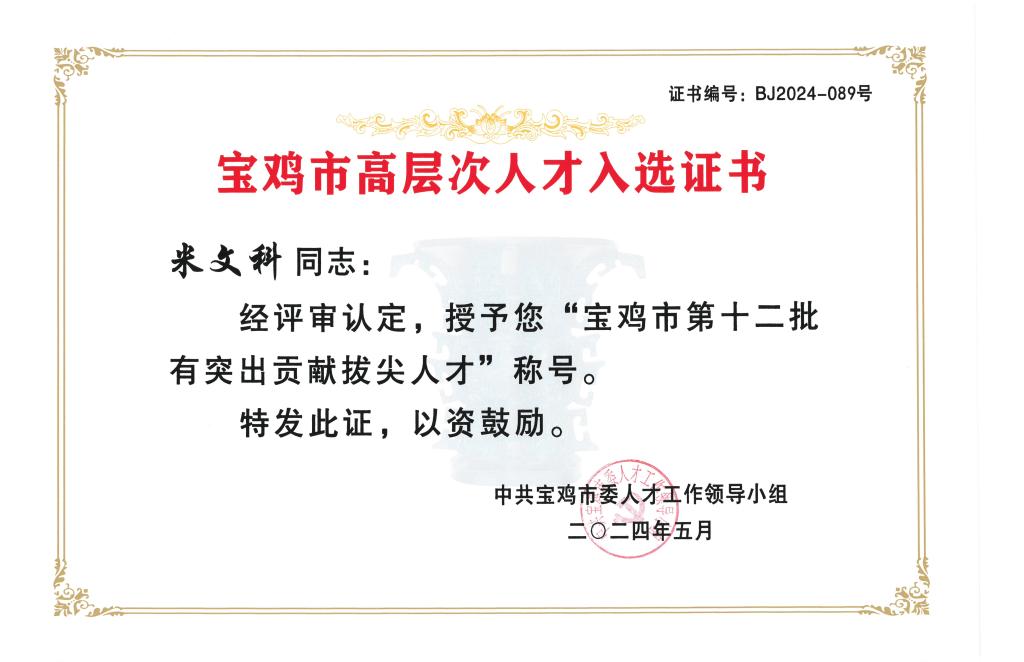 近日,中共宝鸡市委人才工作领导小组印发《关于命名宝鸡市第十二批有突出贡献拔尖人才和青年拔尖人才的决定》,365上市集团官网刘晓勇、米文科两位教授入选宝鸡市第十二批有突出贡献拔尖人才。