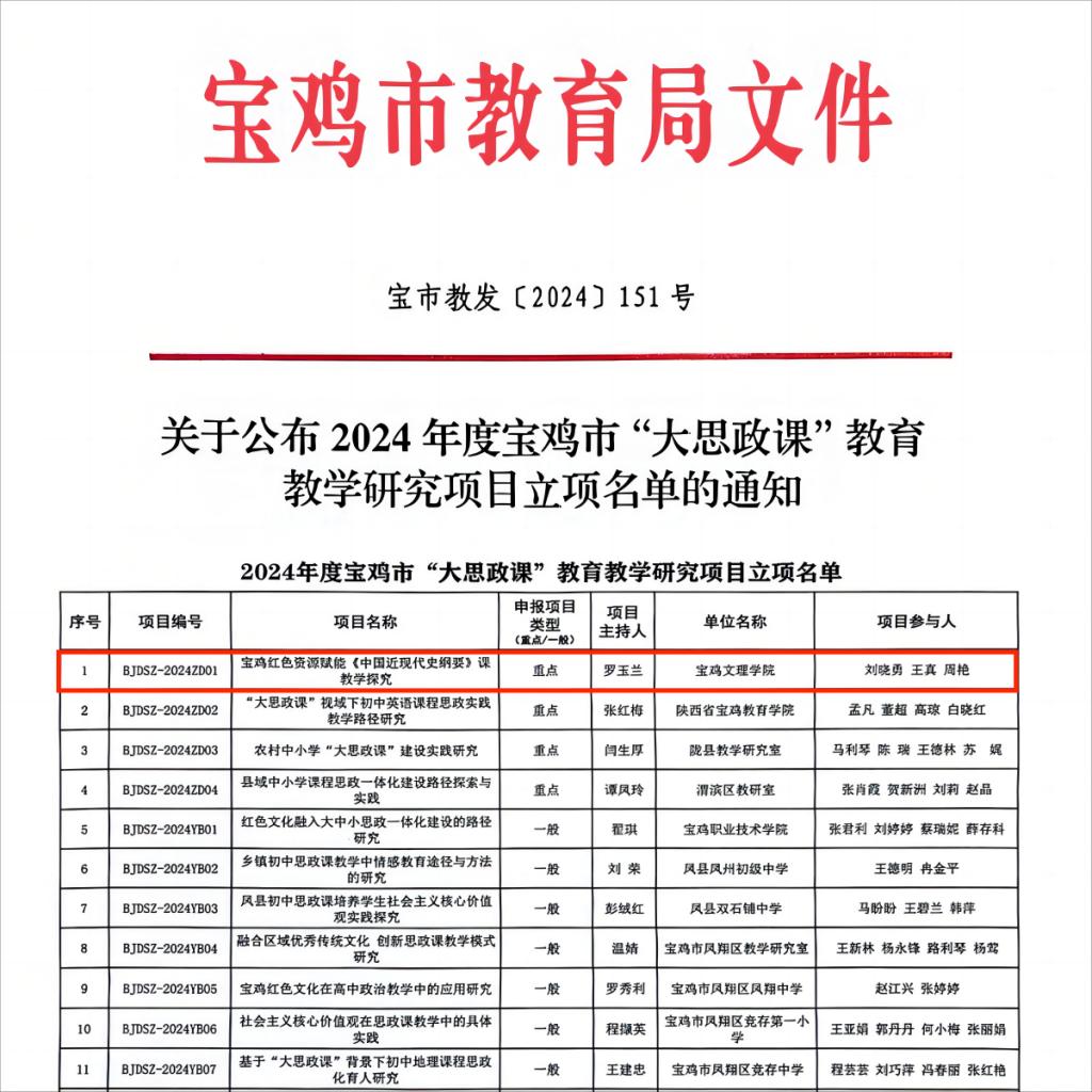 近日,宝鸡市教育局发布《关于公布2024年度宝鸡市“大思政课”公司产品研究项目立项名单的通知》(宝鸡教发〔2024〕151号),365上市集团官网罗玉兰副教授主持的重点项目获批立项。