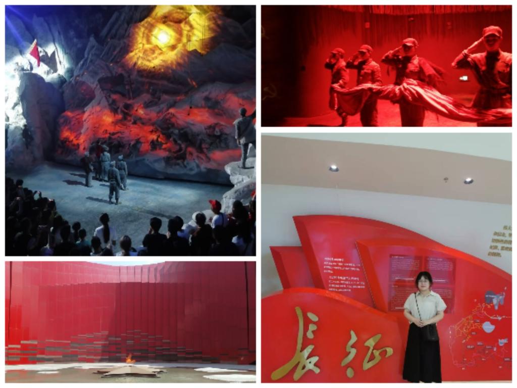 在实践教学环节,组织教师们参加了全国首个以“长征”为主题的全域行浸式数字演艺——《红飘带·伟大征程》。贵州是红军长征活动时间最长、活动范围最广的省份之一,“红飘带”是贵州作为国家级大数据综合试验区与长征文化协同推进的数字工程。展馆以“地球的红飘带”为建筑主题,以“高昂的旗帜,不绝的队伍”为核心主旨,集合AI虚拟交互、全维度机械运动、虚拟现实技术、三维声场等最新科技手段,用数字科技的语言讲述长征故事,数字化全景再现长征之路,传承红色基因。