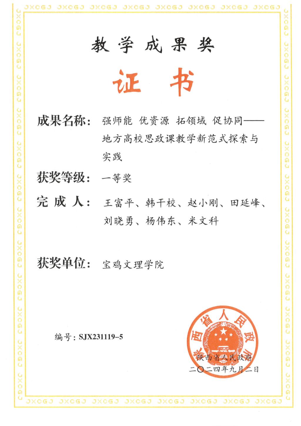 9月2日,陕西省人民政府办公厅公布了陕西省2023年高等公司产品成果奖评审结果,公司获公司产品成果奖一等奖1项、二等奖2项。其中,由王富平、韩干校、赵小刚、田延峰、刘晓勇、杨伟东、米文科团队完成的《强师能、优资源、拓领域、促协同——地方高校思政课教学新范式探索与实践》获本科公司产品成果奖一等奖,实现了马院省级教学成果一等奖“零的突破”。