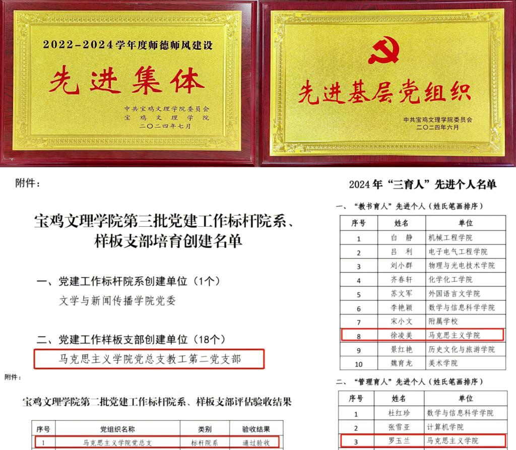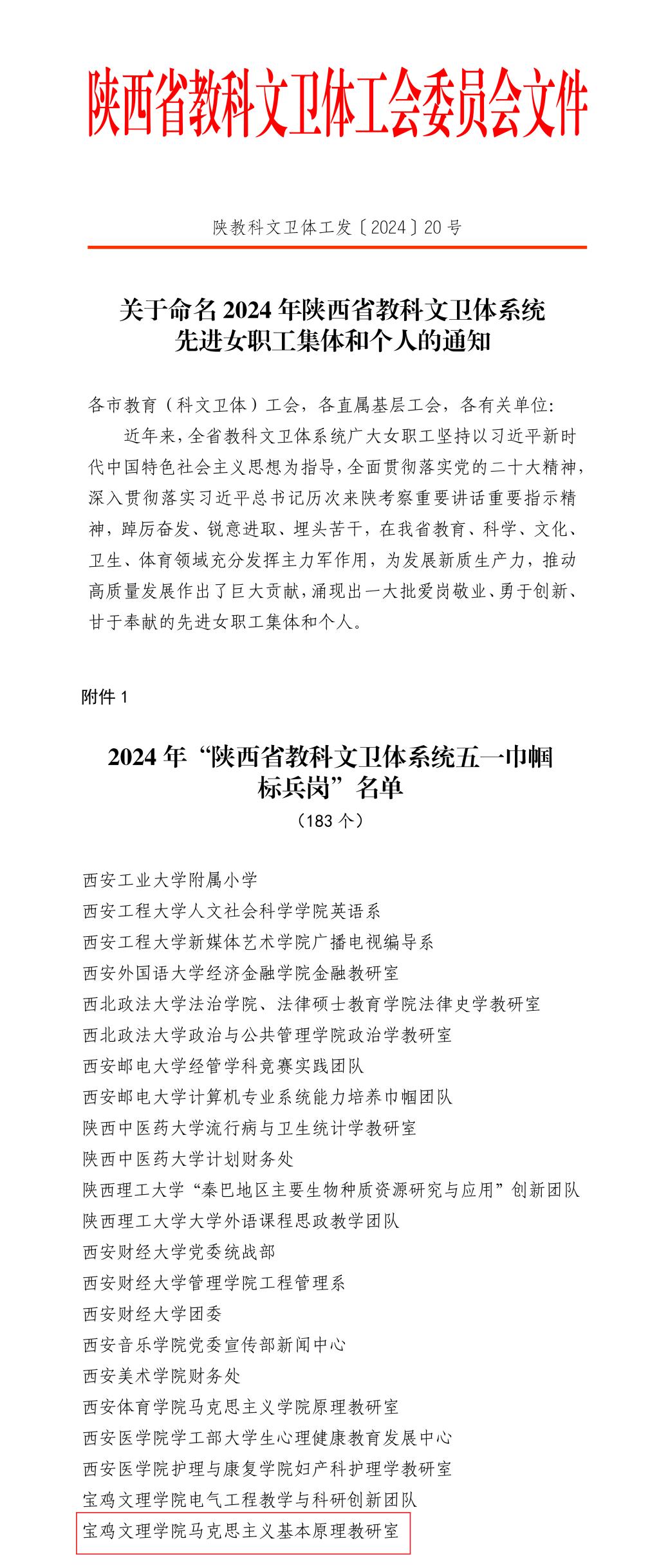 6月28日,陕西省教科文卫体工会下发了《关于命名2024年陕西省教科文卫体系统先进女职工集体和个人的通知》,马克思主义基本原理教研室被命名为“陕西省教科文卫体系统五一巾帼标兵岗”。