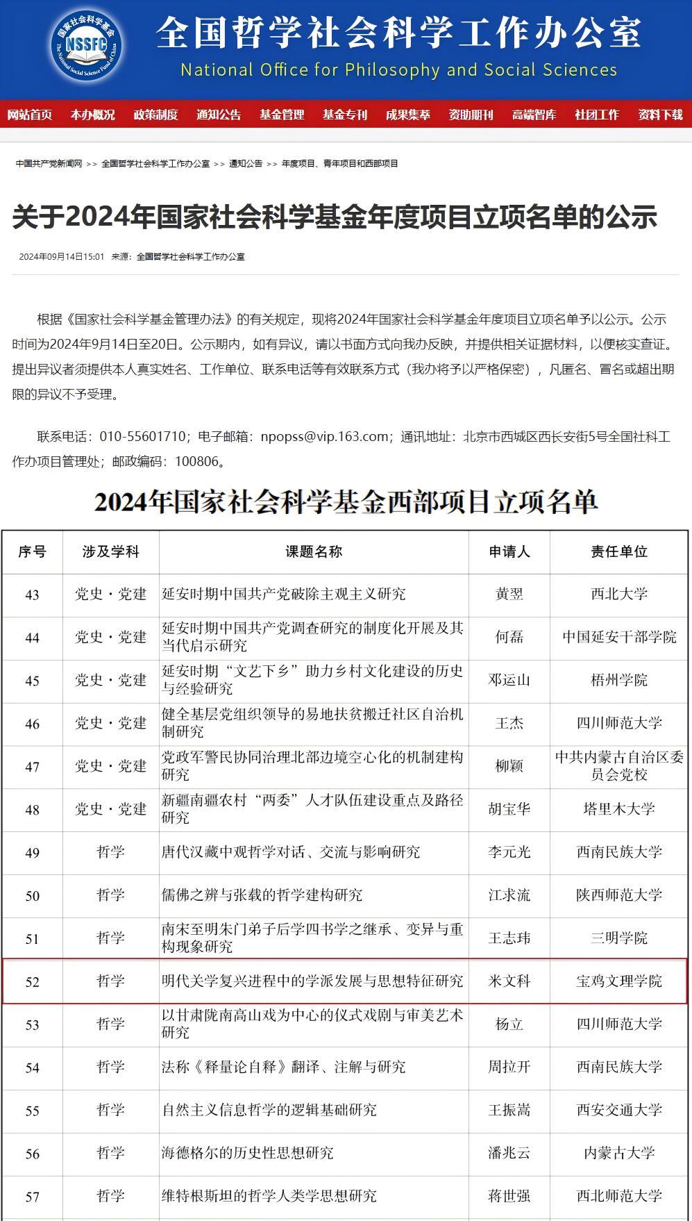 10月15日,全国哲学社会科学工作办公室发布《关于2024年国家社会科学基金年度项目立项名单的公示》,365上市集团官网米文科教授主持申报的《明代关学复兴进程中的学派发展与思想特征研究》获批2024年国家社会科学基金西部项目(项目编号:24XZX004)。