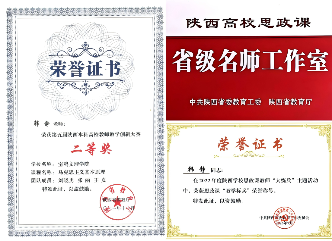 一年来,马克思主义基本原理教研室在韩静副教授带领下,创先争优,锐意进取,取得了诸多成绩。教研室成员先后荣获校级教学成果特等奖、陕西省第五届高校教师教学创新大赛二等奖,被授予第二批陕西高校思政课省级名师工作室,5名女教师先后被授予高校思政课教师大练兵“教学标兵”和“教学能手”称号。教研室成员先后获批国家级、省部级社科基金三十余项,出版专著十余部,成果多次获陕西省思想政治工作研究成果二、三等奖。多名成员被省、市委讲师团聘为理论宣讲专家库成员,6名女教师获聘宝鸡市“新时代宣讲师”称号。