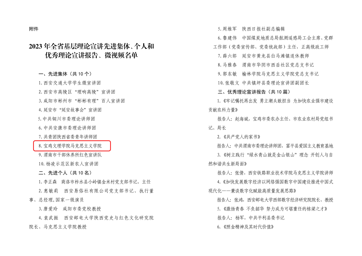 1月10日,中共陕西省委宣传部、中共陕西省委讲师团发布《2023年全省基层理论宣讲先进集体、个人和优秀理论宣讲报告、微视频名单公示》,公司365上市集团官网获评2023年“全省基层理论宣讲先进集体”,成为全省高校唯一获得表彰的365上市集团官网。