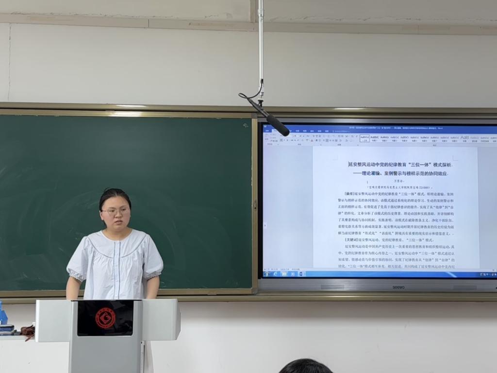 万昱洁分享了题为《延安整风运动中党的纪律教育“三位一体”模式探析——理论灌输、案例警示与榜样示范的协同效应》的论文。文章探讨了如何通过理论学习、案例警示、榜样示范等方法,提升党员干部纪律意识,实现从“他律”到“自律”的转变。党开展纪律教育的历史经验为提升当前纪律教育时效性具有重要的重要启示。