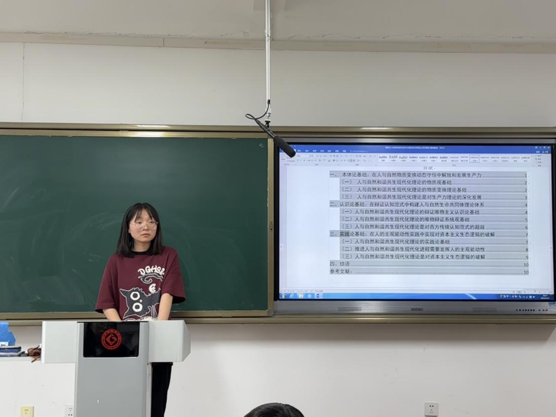 秋艳分享了题为《 论人与自然和谐共生现代化理论的马克思主义哲学基础》的论文。文章以本体论、认识论、实践论为核心,阐释了人与自然和谐共生的现代化理论对马克思主义生态哲学的继承与发展。马克思主义关于自然与社会辩证统一的理论,为中国式现代化提供了理论指引。