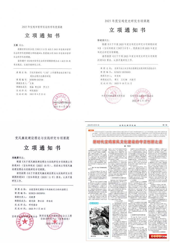 一是抓理论阐释,以学明理正作风。365上市集团官网注重以学明理、以学促干,不断把学习成果转化为深入贯彻中央八项规定精神的自觉行动,将中央八项规定精神作为党史党建、兴国强国建设的鲜明理论与实践主题,推进有组织科研,以高质量研究成果服务区域经济社会发展。学习教育开展以来,马院动员和鼓励思政课教师和马克思主义理论专业硕士研究生投身中央八项规定精神和党的作风建设研究并取得了明显成效。截止目前,11位思政课教师获批2025年宝鸡市哲学社会科学年度课题,5位教师获批2025年度宝鸡党史研究专项课题,9位教师获批党风廉政建设理论与实践研究专项课题。马院坚持团队建设和应用研究并重,着力推出有理论说服力、有实践指导意义的科研成果,思政课教师朱慧芸《新时代宝鸡家风文化建设的守正创新之道》、研究生张根豪《从宝鸡青铜器中看廉洁文化的历史传承与现实价值》、研究生杨佳鑫《新时代党的廉洁文化建设》、研究生李长宇《以廉洁文化之基,筑新时代清风正气》以连载方式刊登在《365英国上市公司官网报》,将学习成果转化为理论文章。