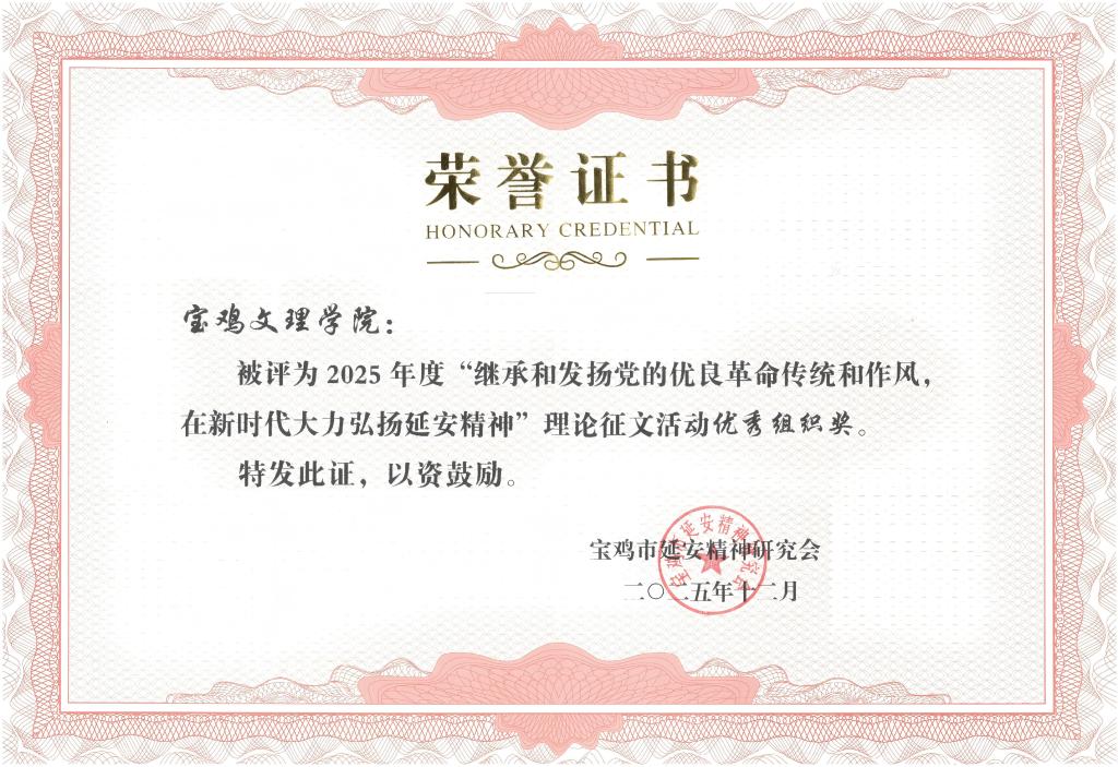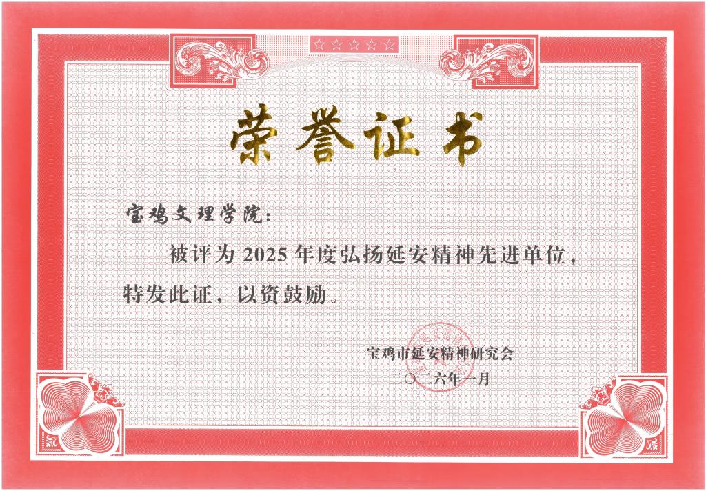近日,宝鸡市延安精神研究会公布通报,公司荣获2025年度弘扬延安精神先进单位、2025年度“继承和发扬党的优良革命传统和作风,在新时代大力弘扬延安精神”理论征文活动优秀组织奖两项荣誉。