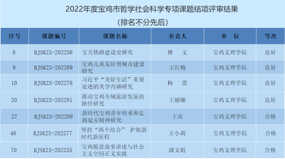近日,宝鸡市哲学社会科学工作领导小组办公室发布2022年度宝鸡市哲学社会科学专项课题结项公告。