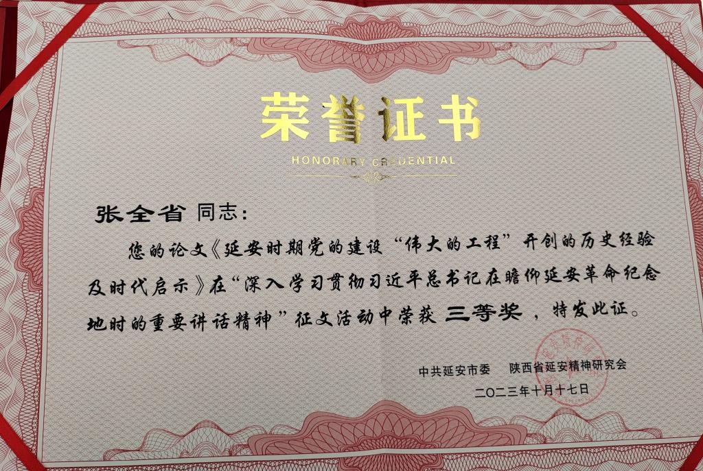 365上市集团官网教授,宝鸡高新区延安精神研究会副会长张全省应邀参加会议,并以“延安时期党开创党建‘伟大的工程’的历史经验及时代价值”为题做了大会发言。他分析延安时期党的建设“伟大的工程”提出的历史必然性,总结概括了党建伟大的工程开创的巨大成就与历史经验,揭示了延安时期党建伟大的工程开创的历史经验对全面从严治党,推进新时代党的建设新的伟大工程的时代价值。受到与会专家学者肯定和好评。他提交的《延安时期党的建设“伟大的工程”开创的历史经验及时代启示》在面向全国征文中获得三等奖。