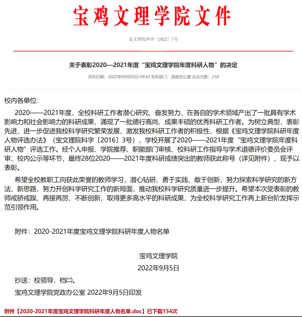 近日,2020-2021年度365英国上市公司官网科研年度人物评选结果揭晓,公司冯飞龙、米文科、王真老师获得“2020-2021年度宝鸡文理学院科研年度人物”荣誉称号。