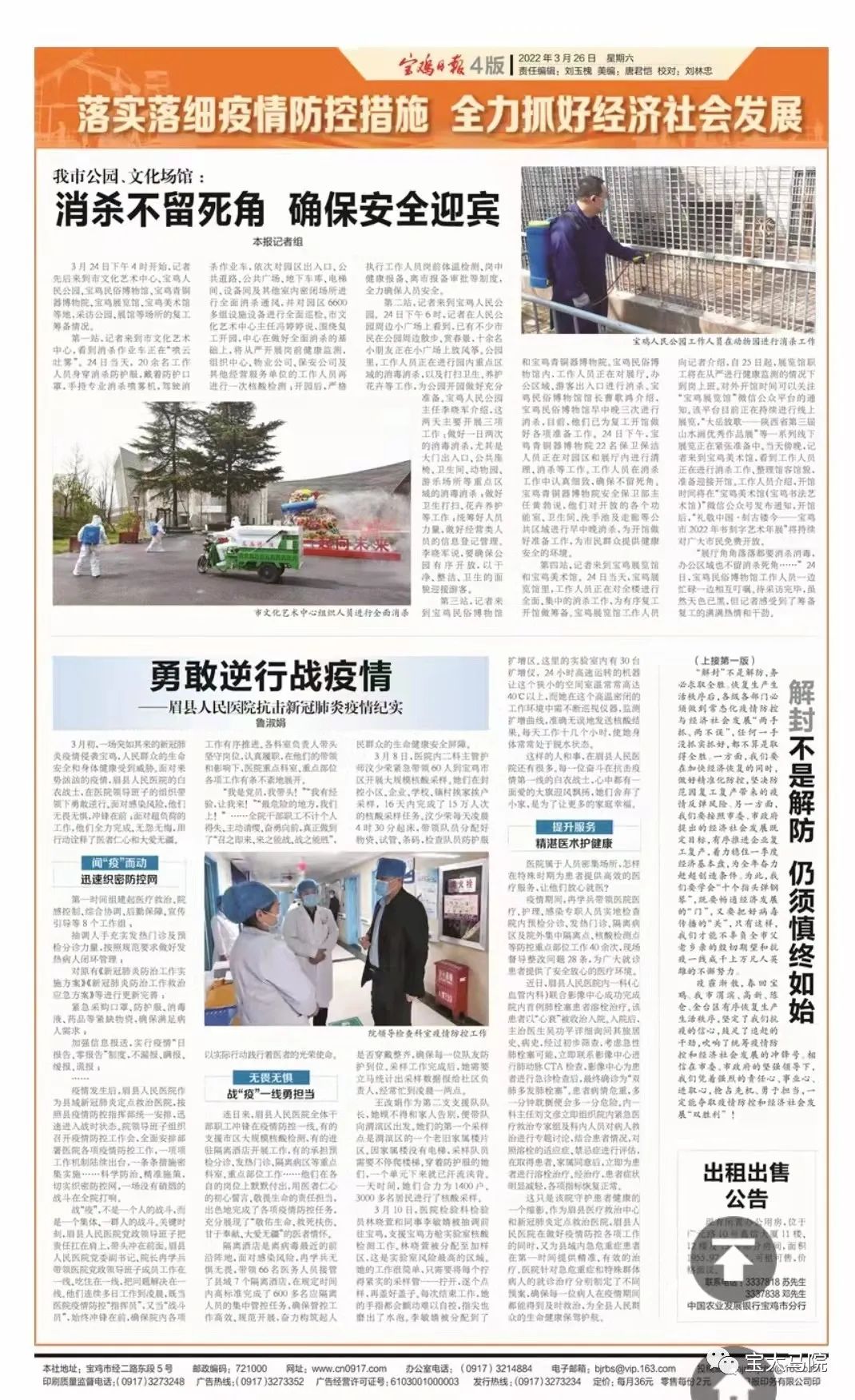 3月26日,《宝鸡日报》头版刊发公司365上市集团官网经理、陕西省重点中国特色社会主义理论体系研究中心(宝鸡基地)主任刘晓勇疫情防控评论文章《解封不是解防仍需慎终如始》。