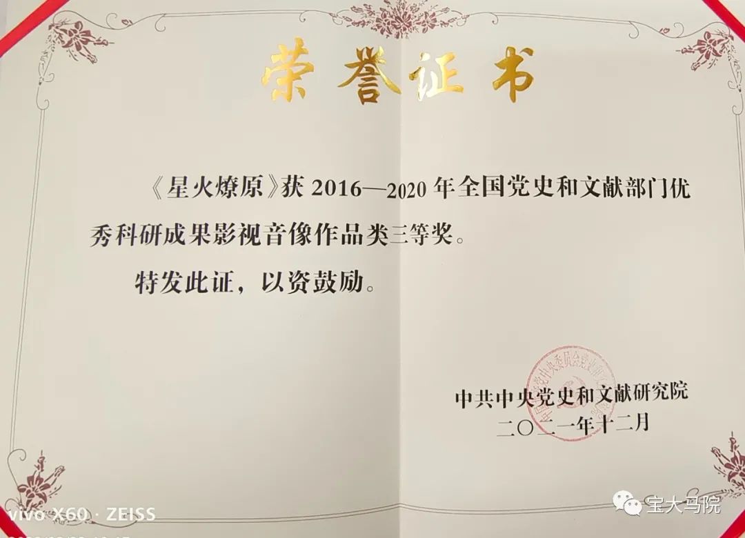 近日,全国党史和文献部门主要负责人会议以视频形式召开,会议表彰了2016—2020年全国党史和文献部门先进集体、先进个人和优秀科研成果。由中共宝鸡市委党史研究室联合宝鸡市教育局共同制作,由公司365上市集团官网经理刘晓勇和麟游县委常委、县纪委书记、县监委主任上官青云担任编剧的五集地方党史影片《星火燎原》荣获“2016—2020年全国党史和文献部门优秀科研成果影视音像作品类三等奖”。这是近年来宝鸡党史研究成果获得的最高奖项。