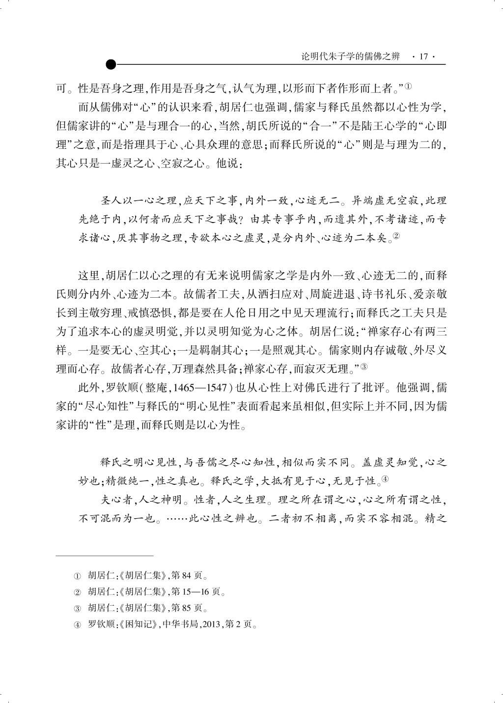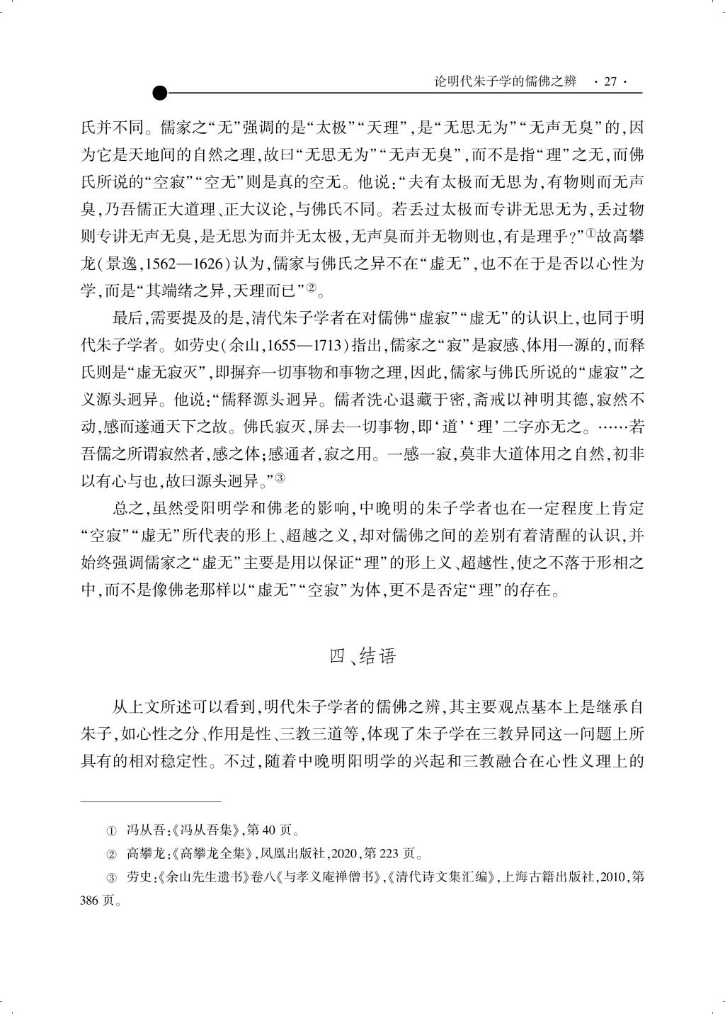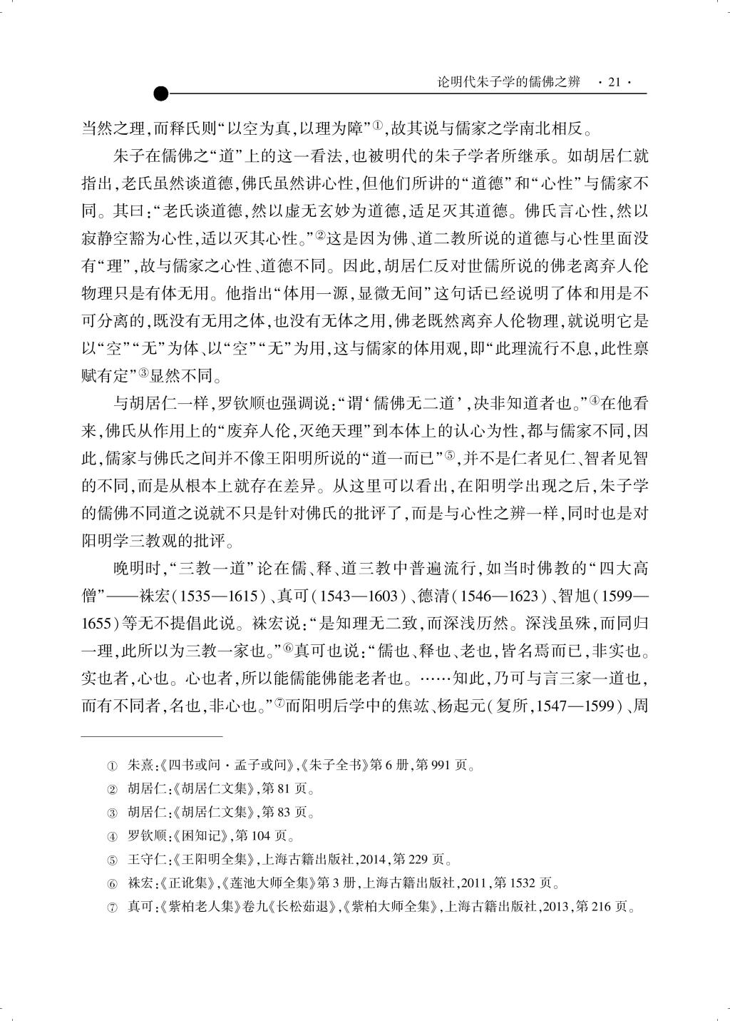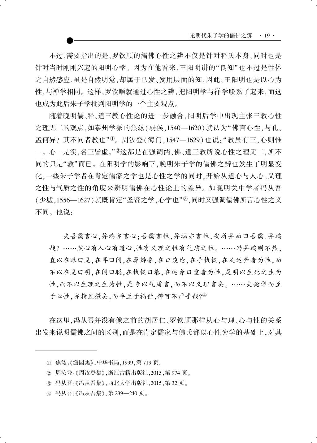 文章从心性之分、三教三道、儒佛“虚无”之异三个方面对于儒家与佛氏的思想进行辨析,指出明代朱子学者的儒佛之辨,其主要观点基本上是继承自朱子,体现了朱子学在三教异同这一问题上所具有的相对稳定性。不过,随着中晚明阳明学的兴起和三教融合在心性义理上的进一步深入,朱子学者在对儒佛异同的看法上也发生了一些新的变化。