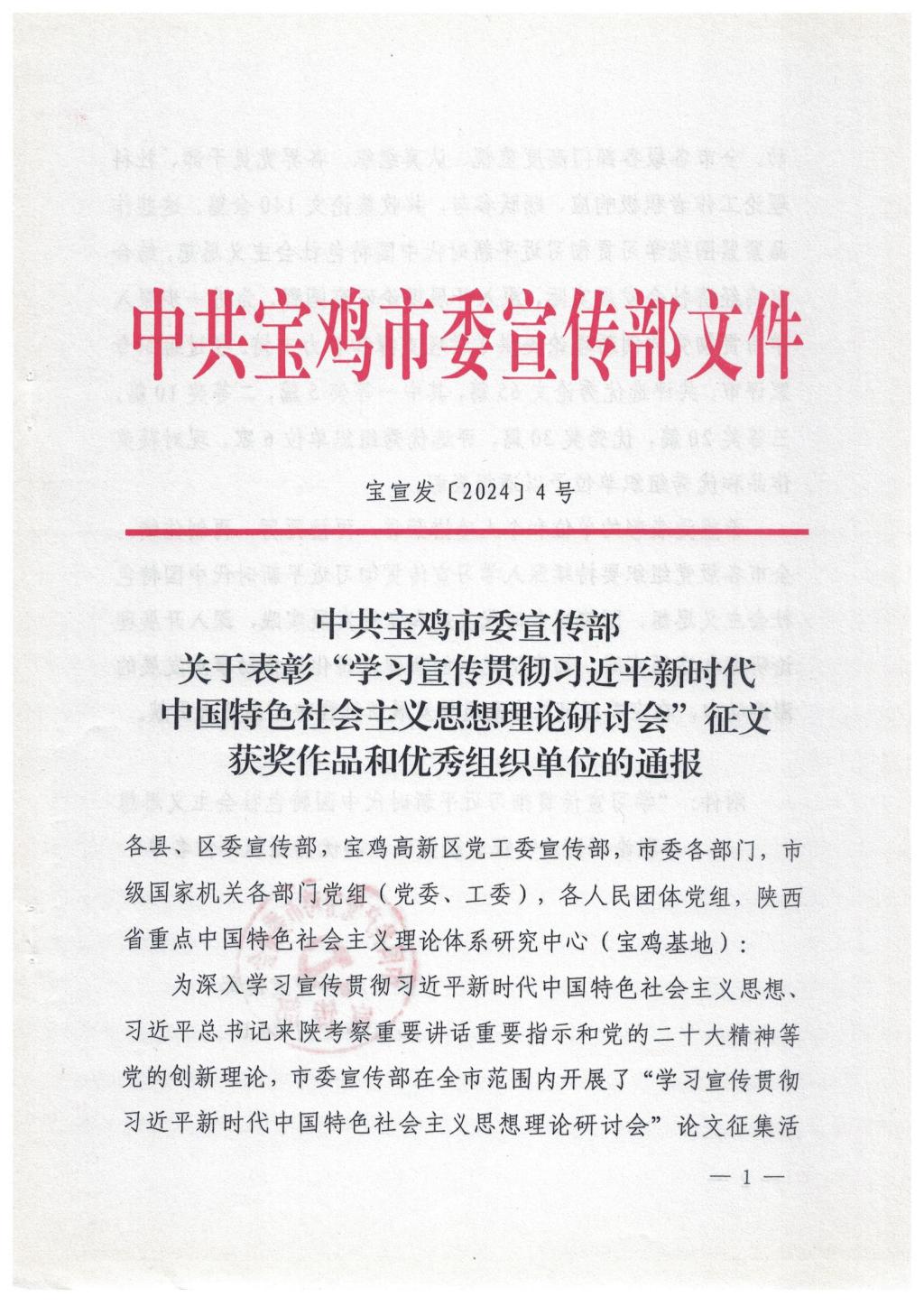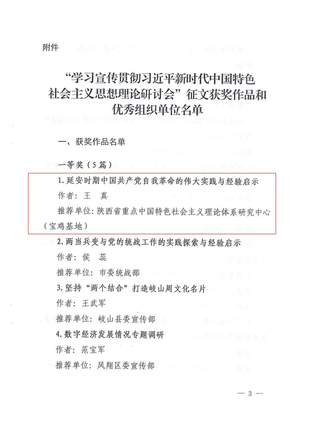 近日,中共宝鸡市委宣传部发布《关于表彰“学习宣传贯彻习近平新时代中国特色社会主义思想理论研讨会”征文获奖作品和优秀组织单位的通报》,公司王真教授的作品《延安时期中国共产党自我革命的伟大实践与经验启示》获得一等奖,刘晓勇教授的作品《防范化解意识形态风险需要发扬斗争精神》、傅文老师的作品《“以党的自我革命引领社会革命”战略思想的形成逻辑、历史经验和实践路径》获得二等奖,韩静博士的作品《中国构建人类命运共同体方案的道路选择、制度优势和文化底蕴》获得三等奖,陕西省重点中国特色社会主义理论体系研究中心(宝鸡基地)获得“优秀组织单位”荣誉称号。