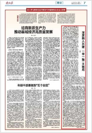 1月11日,《陕西日报》刊发了中特中心研究员刘辉教授的理论文章《加快形成新质生产力,增强高质量发展新动能》。2月8日,《陕西日报》刊发了中特中心研究员杨忠泰教授的理论文章《构建具有陕西特质的现代化产业体系》。3月26日,《陕西日报》刊发了中特中心研究员李建霞老师的理论文章《深度融入共建“一带一路”大格局》。4月2日,《陕西日报》刊发了中特中心主任刘晓勇教授的理论文章《探索推广绿水青山转化为金山银山的路径》。