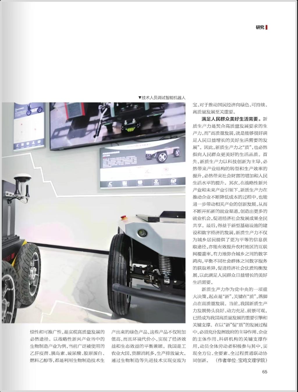 系列科研成果系统回答了新质生产力是什么、为什么、怎么做三个问题,被中国社会科学网、学习强国和陕西党建网等十余家主流网站转载,产生了广泛学术影响。陕西省重点中国特色社会主义理论体系研究中心宝鸡基地打破创新壁垒,凝聚全校力量,进行联合攻关,较好地服务了地方经济社会发展,为做好学科融合,强化智库作用做出了示范。(科研管理处、陕西省重点中国特色社会主义理论体系研究中心宝鸡基地 文、图/赵晓丹 审核/王晓玲、刘晓勇)