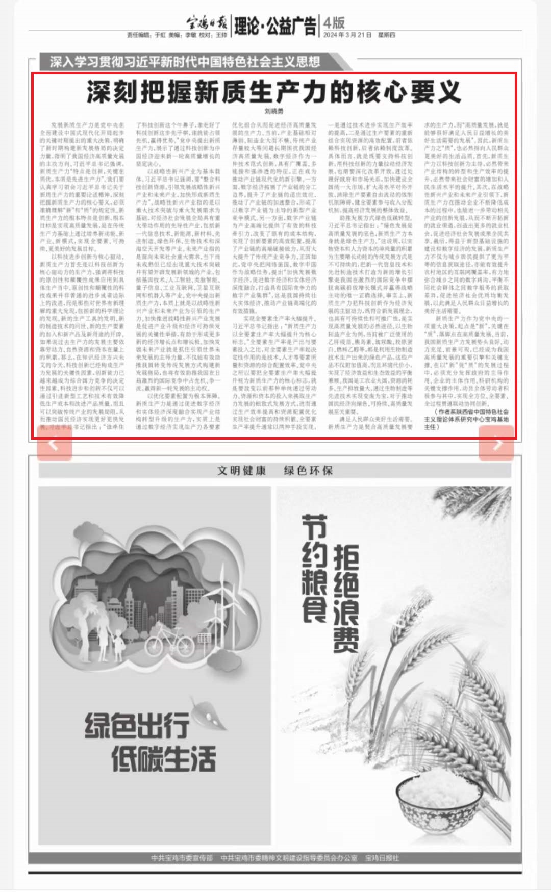 3月21日,《宝鸡日报》刊发了中特中心主任刘晓勇教授的理论文章《深刻把握新质生产力的核心要义》。3月28日,《宝鸡日报》刊发了中特中心研究员张丽副教授的理论文章《发展新质生产力是推动高质量发展的内在要求》。4月7日,《宝鸡日报》刊发了中特中心研究员刘晓科副教授的理论文章《念好“新”“转”“融”三字诀,稳步培育新质生产力》。