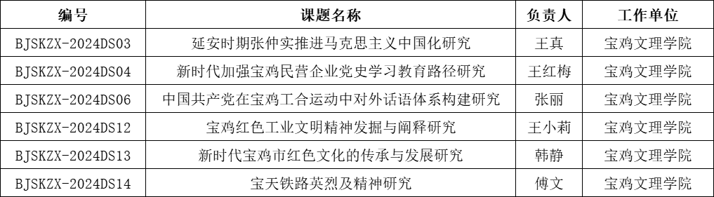 近日,宝鸡市哲学社会科学工作领导小组办公室发布了《2024年度宝鸡党史研究专项课题立项评审结果公示》,公司王真、王红梅、张丽、王小莉、韩静、傅文老师负责的课题获批立项。