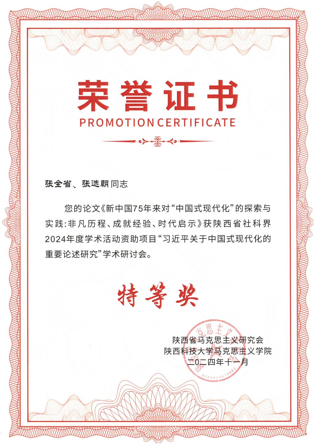 近日,陕西省马克思主义研究会、陕西科技大学365上市集团官网联合发布《“习近平关于中国式现代化的重要论述研究”学术研讨会优秀论文表彰决定》,公司张全省、张选朝老师合撰的《新中国75年来对“中国式现代化”的探索与实践:非凡历程、成就经验、时代启示》荣获“习近平关于中国式现代化的重要论述研究”学术研讨会论文特等奖。