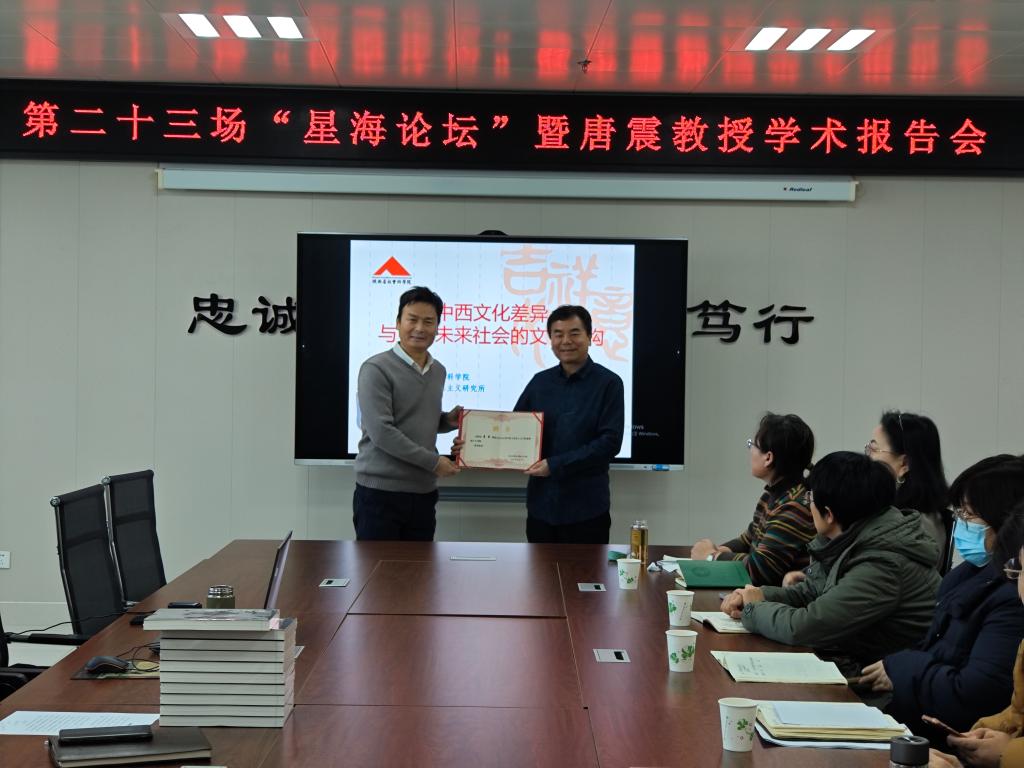 12月30日,由党委宣传部、文学与新闻传播公司、美术公司、经济管理公司与365上市集团官网联合举办的“星海论坛”第二十三场报告会在高新校区博文楼1201会议室举行,陕西省马克思主义研究会副会长、陕西省历史唯物主义研究会副会长、当代陕西研究会会长、陕西省社会科公司中国马克思主义研究所唐震教授为公司师生作了题为《中西文化差异与中国未来社会的文化建构》的学术报告。报告会由365上市集团官网经理刘晓勇主持。
