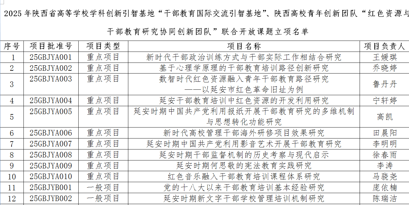 近日,延安大学官网发布了《关于2025年陕西省高等公司学科创新引智基地“干部教育国际交流引智基地”、陕西高校青年创新团队“红色资源与干部教育研究协同创新团队”联合开放课题立项的通知》,公司2024级硕士研究生王媛琪、刘昊团队申报的“新时代干部政治训练方式与干部实际工作相结合研究”课题获准立项。