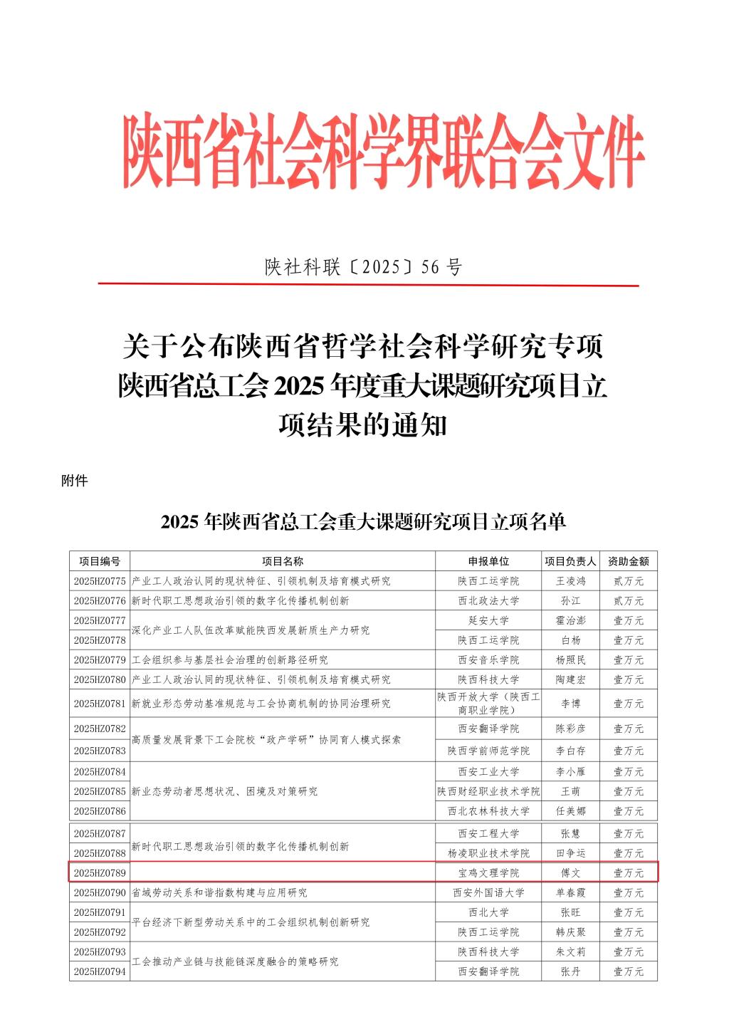 近日,陕西省社会科学界联合会发布《关于公布陕西省哲学社会科学研究专项陕西省总工会2025年度重大课题研究项目立项结果的通知》,公司傅文副教授申报的《新时代职工思想政治引领的数字化传播机制创新》成功获批立项。
