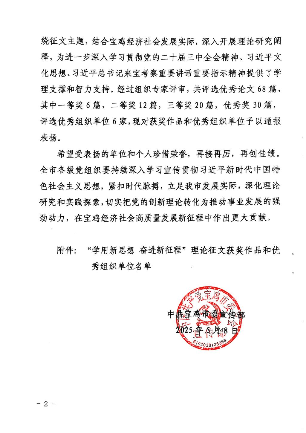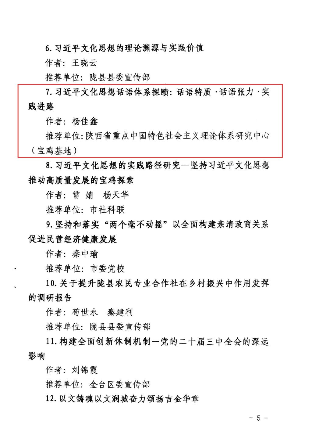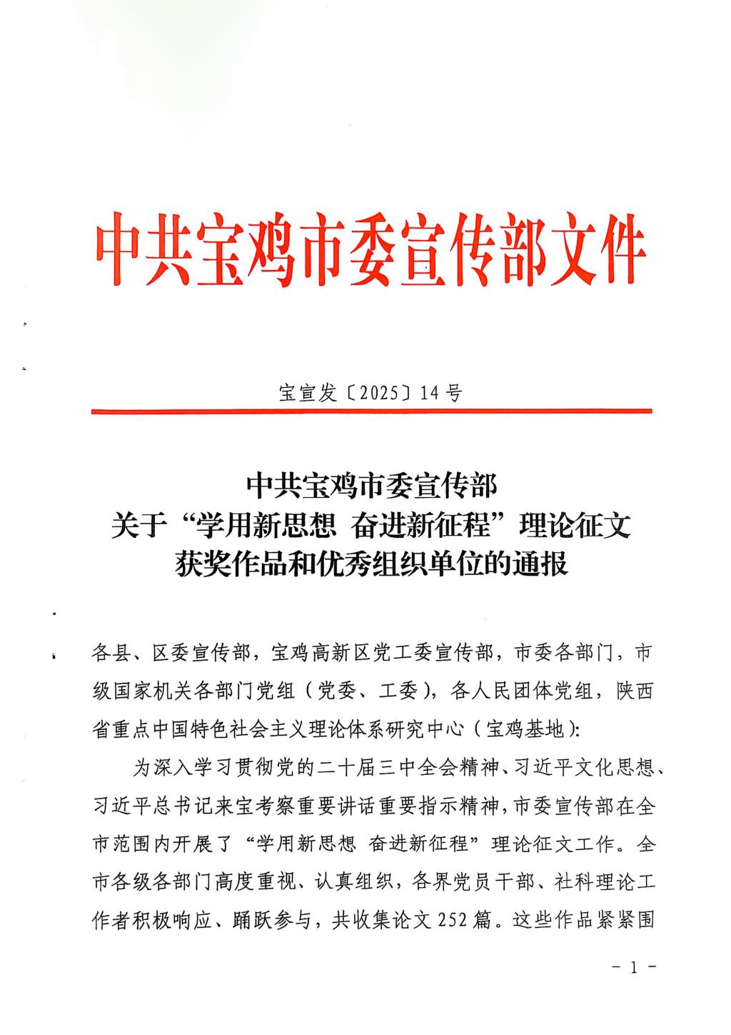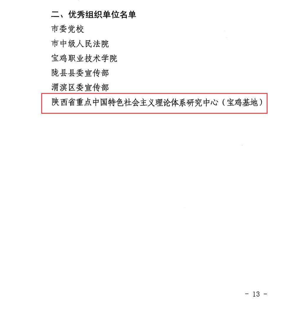 本次获奖不仅是对陕西省重点中国特色社会主义理论体系研究中心(宝鸡基地)成员智慧结晶的高度认可,更是对其积极推动理论与实践结合工作的有力肯定。今后基地将持续深入开展习近平新时代中国特色社会主义思想理论研究与阐释工作,进一步聚焦宝鸡经济社会发展的关键问题,发挥理论引领作用,为宝鸡高质量发展贡献更多智慧力量。【科研管理处、陕西省重点中国特色社会主义理论体系研究中心(宝鸡基地) 文、图/张吉祥 审核/王晓玲、刘晓勇】
