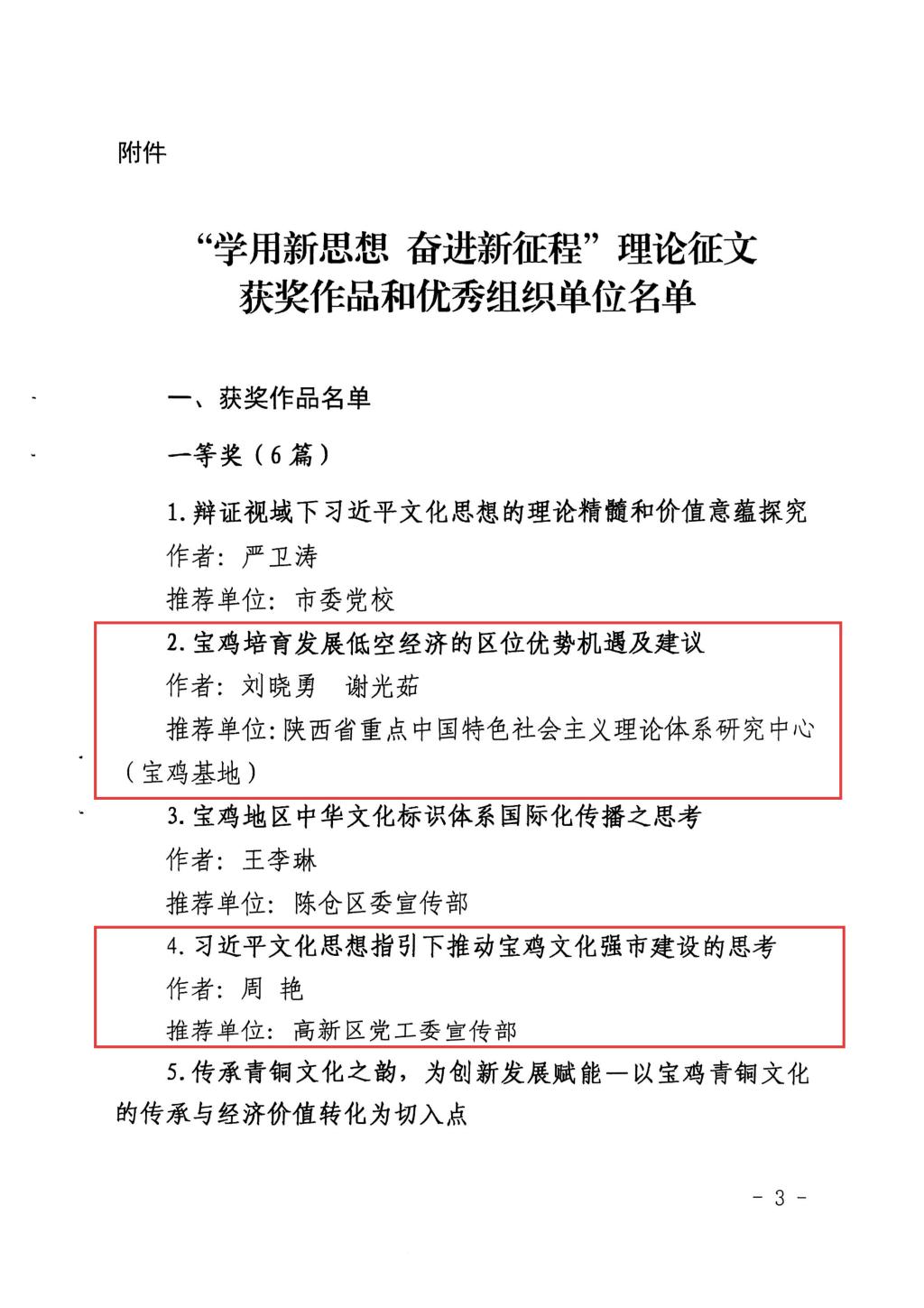 近日,中共宝鸡市委宣传部发布《关于“学用新思想 奋进新征程”理论征文获奖作品和优秀组织单位的通报》,陕西省重点中国特色社会主义理论体系研究中心(宝鸡基地)主任刘晓勇教授和硕士生谢光茹合作的作品《宝鸡培育发展低空经济的区位优势机遇及建议》、硕士生周艳的作品《习近平文化思想指引下推动宝鸡文化强市建设的思考》获得一等奖,刘晓勇教授和硕士生秋艳合作的作品《习近平生态文明思想的马克思主义哲学意蕴》、刘晓科副教授和硕士生邢灵瑶、江嘉韬合作的作品《宝鸡现代化产业体系构建与新质生产力培育研究》、硕士生杨佳鑫的作品《习近平文化思想话语体系探赜:话语特质·话语张力·实践进路》获得二等奖,陕西省重点中国特色社会主义理论体系研究中心(宝鸡基地)获得“优秀组织单位”荣誉称号。