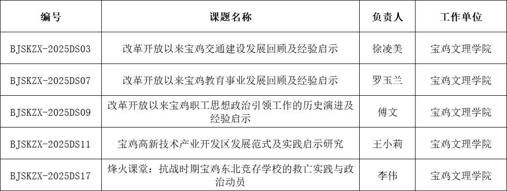 据悉,2025年度宝鸡党史研究专项课题围绕改革开放和社会主义现代化建设新时期以来,宝鸡各级党组织带领人民群众推进改革开放和中国特色社会主义建设的探索实践、重大成就和经验启示开展研究,经专家评审共有17个项目获准立项。