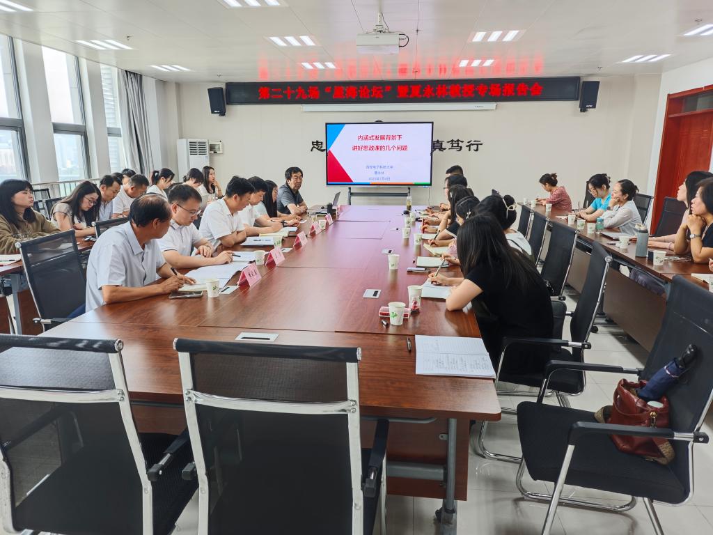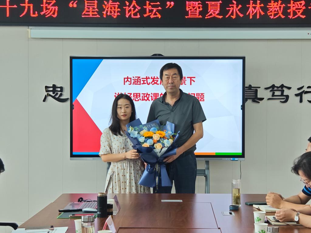 专题报告会环节,教育部第三批网络教学名师、陕西省教学名师、西安电子科技大学365上市集团官网夏永林教授作了《内涵式发展背景下讲好思政课的几个问题》的报告,他剖析了思政课教师面临的困惑与焦虑、矛盾与问题,从培养“大思政课”思维的理念出发,强调要做好教材话语向教学话语、理论话语向生活话语、传统话语向现代话语、说教话语向引导话语、工作话语向规范话语的转化,成为有情怀、有想法、有能力的思政课教师。报告结束后,夏老师还与公司参赛教师座谈。参赛教师代表邵雅丽为夏永林教授献花。