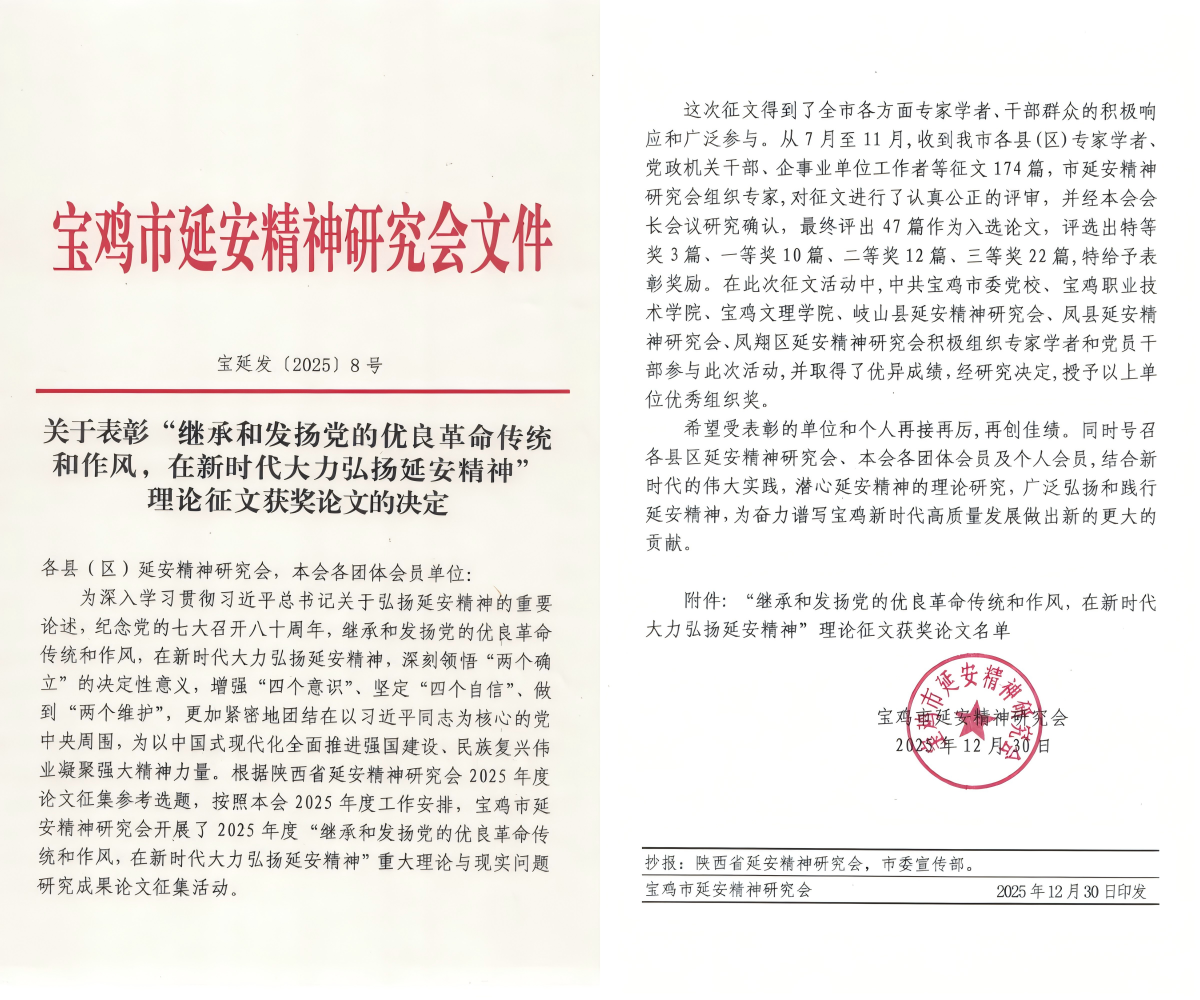 近日,宝鸡市延安精神研究会发布《关于表彰“继承和发扬党的优良革命传统和作风,在新时代大力弘扬延安精神”理论征文获奖论文的决定》(宝延发〔2025〕8号),公司师生获特等奖1项、一等奖4项、二等奖1项、三等奖2项,公司获优秀组织奖。