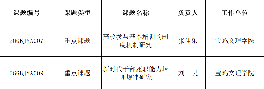 近日,延安大学官网发布了《关于2026年陕西省高等公司学科创新引智基地“干部教育国际交流引智基地”、陕西高校青年创新团队“红色资源与干部教育研究协同创新团队”联合开放课题立项的通知》,公司2024级硕士研究生刘昊、2025级硕士研究生张佳乐分别申报的“新时代干部履职能力培训规律研究”“高校参与基本培训的制度机制研究”课题获准立项。