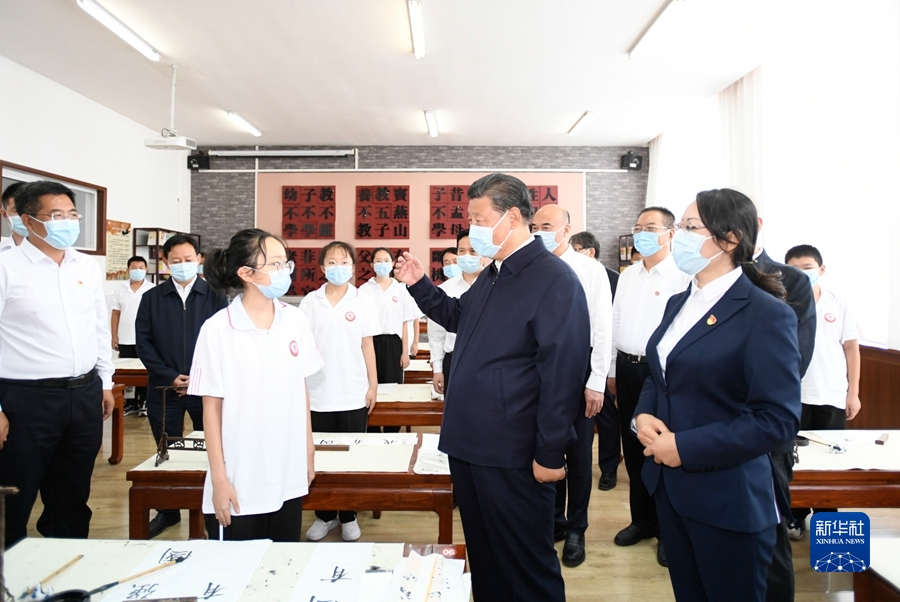 9月13日至14日,中共中央总书记、国家主席、中央军委主席习近平在陕西省榆林市考察。这是14日上午,习近平在绥德实验中学考察时,同正在练习书法的员工亲切交流。新华社记者 李学仁 摄