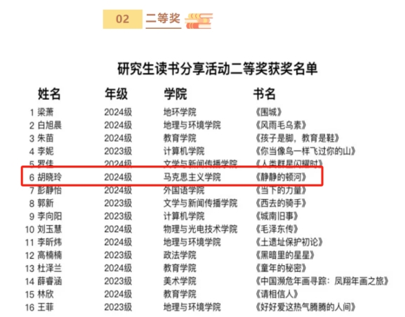 近日,公司党委研究生工作部公布了“以书为友悦读人生”主题读书分享活动获奖名单,公司2024级硕士研究生胡晓玲获得二等奖。