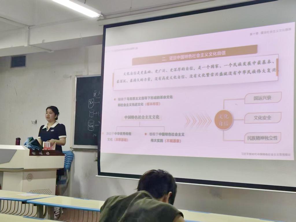 万泽京同学讲授了《习近平新时代中国特色社会主义思想概论》第十章“建设社会主义文化强国”中的第一节和第二节的内容。她以“软实力是什么”作为问题导入,以当红影视作品为主线,论述文化的重要性。首先,万泽京同学以《哪吒之魔童闹海》《2025中央广播电视总台春节联欢晚会》等典型案例,把文化比作“催化剂”,引导同学们思考文化对于民族生存和发展的重要意义。其次,她和同学们一起探讨了“中华文化何以自信”的根本原因。最后,分层次的讲述了“坚持中国特色社会主义文化发展道路”要怎样做,重点分析了“两个结合”,文化工作中的“二为”方向、“双百”方针和“两创”原则,强调同学们要在平时生活中注意挖掘中华优秀传统文化的时代价值,用自己所学专业让传统文化焕发新的生命力。