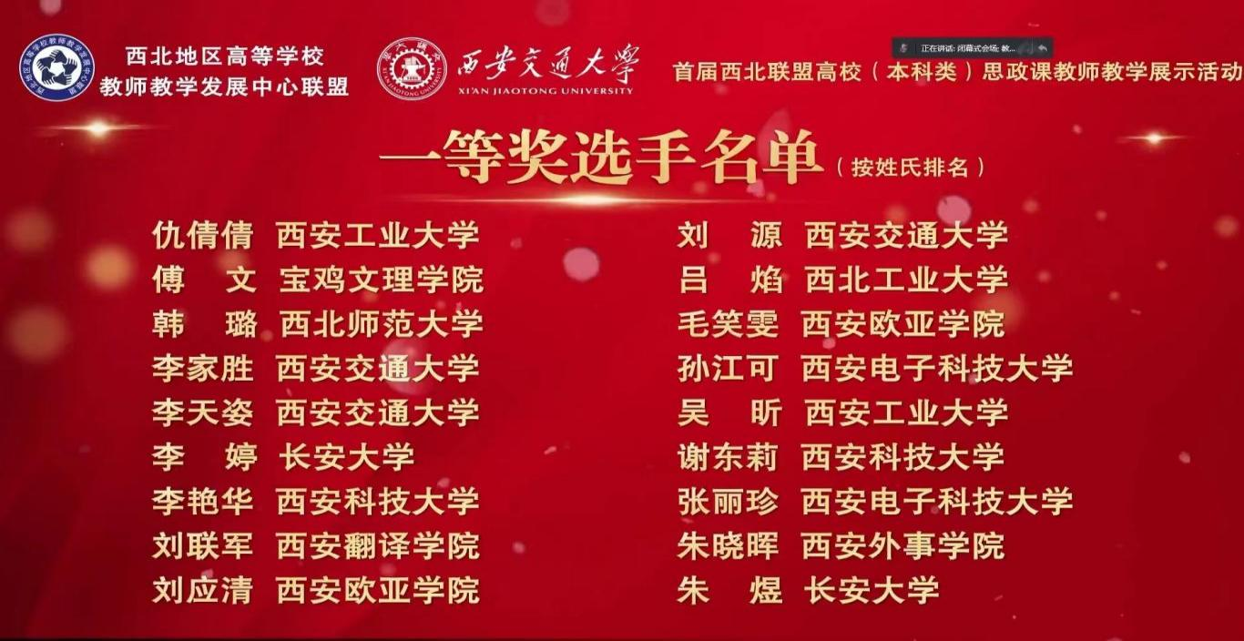 11月20日,首届西北联盟高校思政课教师教学展示活动在西安交通大学举行,进入决赛阶段的教师在“云端”进行了教学展示,公司365上市集团官网教师傅文荣获教学展示活动一等奖,韩静荣获教学展示活动三等奖。